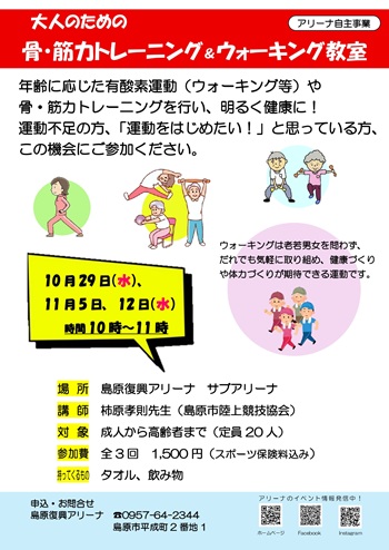 日時:10月29日、11月5日、11月12日(水曜日)場所:サブアリーナ対象:成人から高齢者(定員20人)参加費:全3回 1,500円持ってくる物:室内用シューズ、飲み物など申込方法 電話またはアリーナ事務所で申し込んでください。申し込み問合せ ☎0957-64-2344